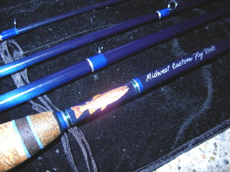 The wraps on this rod are Royal Blue (without Color Preserver) which blends into the dark blue color of the blank to give each wrap a translucent effect and has metallic silver five turn trim bands on the edges of each wrap. It also has some metallic blue trim wraps on both sides of the inscription area on the butt section. Also included on the butt section is a full color trout inlaid under the finish for protection, as well as the Midwest Custom Fly Rods name inscribed onto the butt section ahead of the trout image.